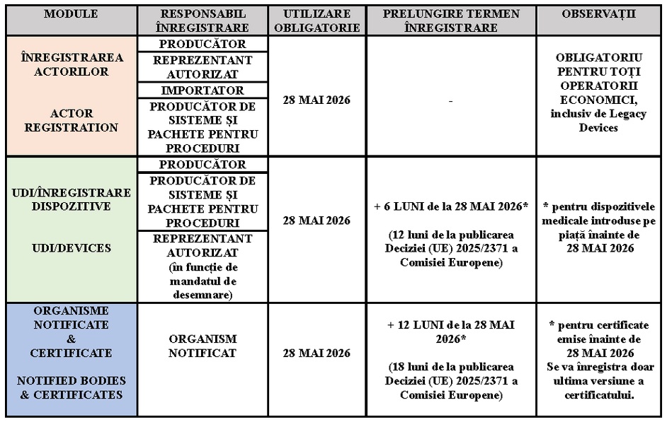 Obligațiile și cerințele legate de Eudamed se aplică de la data care corespunde unei perioade de șase luni de la data publicării menționate anterior(conform art. 123 din MDR, art. 113 din IVDR), respectiv din 28 mai 2026.